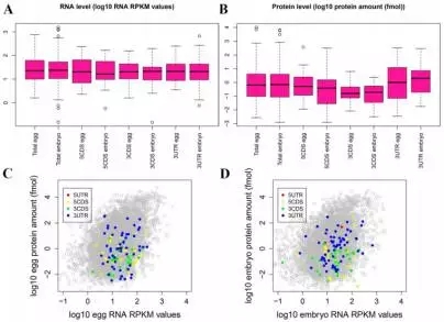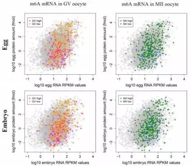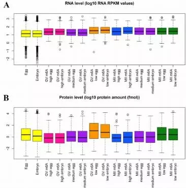 為了探索mRNAs甲基化是否與翻譯有關(guān),作者把mRNA甲基化數(shù)據(jù)與Smits等人已發(fā)表的轉(zhuǎn)錄組和蛋白組數(shù)據(jù)進(jìn)行了整合。通過BLAST分析,在RNA/蛋白數(shù)據(jù)中找到了723個(gè)m6A修飾mRNAs的信息。GV期或者M(jìn)II期卵母細(xì)胞中高m6A峰的RNA水平(log10 RNA RPKM值)比總RNA高(在卵或者胚胎中),但是蛋白水平(log10 protein amount / fmol)比總蛋白水平低(Figure 2)。與高度甲基化的mRNAs相比,低甲基化RNAs顯示出非常高的表達(dá)水平(Figure 3)。這些結(jié)果說明在卵母細(xì)胞或早期胚胎中,m6A修飾可能與mRNA翻譯有關(guān)。