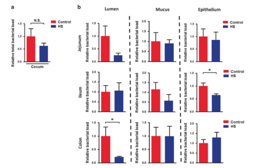 首先,研究人員檢查HS攝入是否會影響腸道細菌。慢性HS喂養(yǎng)后,盲腸中的總細菌負荷略有下降,但無顯著變化(圖1a)。慢性HS喂養(yǎng)后,回腸上皮(圖1b)和結腸腔內(圖1b)的細菌負荷也降低。慢性HS處理顯著降低厚壁菌門和提高擬桿菌的水平,這表明細菌組合物在HS攝入后發(fā)生改變。