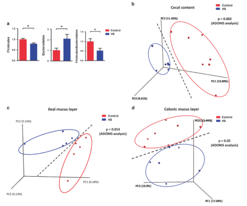 為了研究HS攝入如何影響腸道微環(huán)境,研究人員將HS組的細菌組成與對照組相比,在HS處理后,盲腸中Actinobacteria,F(xiàn)irmicutes和Bacteroidetes在門水平和Actinobacteria以及Clostridia和Bacteroidia的百分比顯著不同。unweighted uniFrac分析結果顯示HS和對照組分別聚集(圖2b)。進一步分析顯示,HS和對照組在回腸粘液層分別聚集(圖2c),而對照組和HS組形成兩個聚類,分離趨勢明顯在結腸粘液層(圖2d)。研究結果表明,慢性HS喂養(yǎng)可能導致腸道生態(tài)失調,細菌計數(shù)和微環(huán)境組成的變化也證明了這一點。