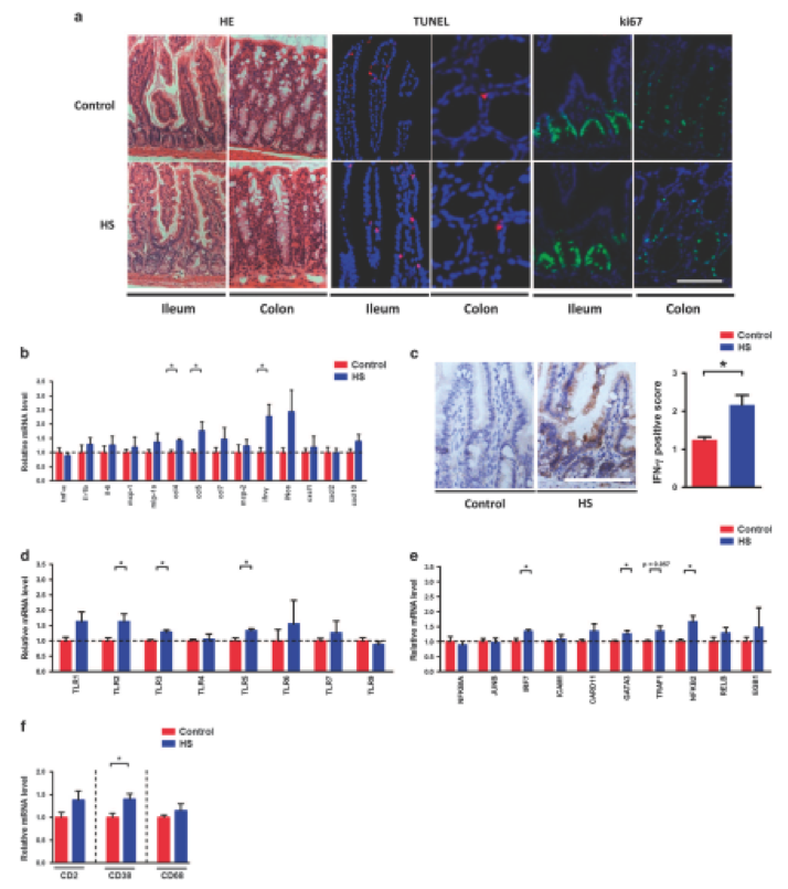 腸道生態(tài)失調通常與腸道病理生理學的改變有關,研究人員檢查了慢性HS喂養(yǎng)對腸道變化的影響。在對照組和HS-喂養(yǎng)組小鼠的回腸和結腸上皮細胞形態(tài)沒有差異(圖3a)。此外,通過TUNEL和ki67染色鑒定的相似數(shù)量凋亡和增殖細胞表明,慢性HS喂養(yǎng)不影響腸道中的細胞死亡(圖3a)。然而,研究人員發(fā)現(xiàn)炎癥標志物表達被慢性HS攝入顯著改變。特別是,Ccl4,Ccl5和Ifn-γ在HS小鼠的回腸中表現(xiàn)出更高的mRNA水平(圖3b)。 IFN-γ免疫組織化學在回腸中的結果證實了基因表達數(shù)據(jù)(圖3c)。由于TLR家族蛋白和Nf-κB是參與病原體相關免疫應答的主要分子,進一步評估TLR家族和Nf-κB基因表達,發(fā)現(xiàn)TLR2,TLR3和TLR5mRNA水平在回腸中趨于更高(圖3d)。同時,HS處理后IRF7,GATA3和NFKB2的表達顯著上調(圖3e)。此外,HS喂養(yǎng)后白細胞中CD38的表達在回腸中升高(圖3f)。然后通過RNA測序進行轉錄組分析,并比較涉及“細胞因子 – 細胞因子受體相互作用”,“ NF-κB信號通路“和”Toll樣受體信號通路“。在回腸和結腸中,兩組之間許多基因的表達是不同的??偟膩碚f,這些數(shù)據(jù)表明慢性HS攝入導致腸炎癥反應中斷。