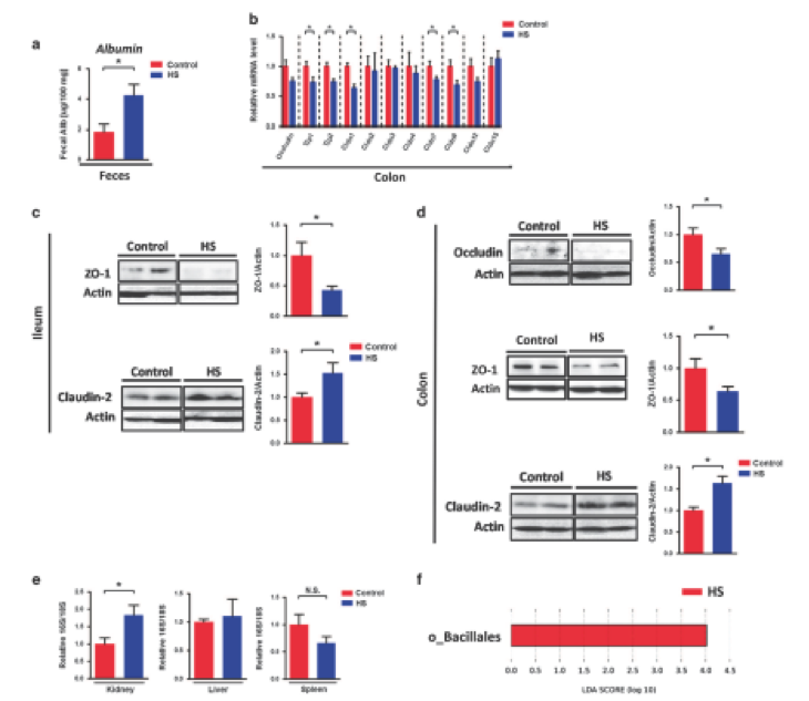 腸道免疫反應受損始終與腸道屏障功能障礙有關,研究人員研究了HS的攝入如何影響腸道屏障功能。HS攝入顯著降低了tjp-1,tjp-2,claudin-1,claudin-7和claudin-8基因的表達(圖4a)。 此外,與對照小鼠相比,HS攝入后,回腸和結腸中屏障形成的緊密連接ZO-1蛋白水平和結腸中的Occludin蛋白水平顯示出較低的趨勢(圖4c和d)。 另一方面,在HS喂養(yǎng)回腸和結腸后,成孔緊密連接蛋白Claudin-2蛋白水平顯著較高(圖4c和d)。這些數(shù)據(jù)清楚地表明腸道腸道屏障被慢性HS攝入所破壞。