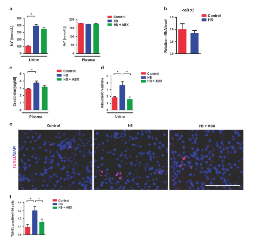 為了進一步闡明HS攝入后腸道生態(tài)失調和腎損傷之間的關系,給小鼠喂養(yǎng)多粘菌素B和新霉素。抗生素給藥確實恢復了HS飼喂誘導的回腸Ifn-γ過表達,通過糞便白蛋白和FD-4滲透監(jiān)測腸道泄漏,以及通過血漿內毒素水平和腎臟16s / 18s比率監(jiān)測的細菌移位,通過尿和血漿Na +濃度測量,抗生素不改變鈉負荷(圖5a)。雖然8周HS喂養(yǎng)并未引起纖維化等進展性腎損傷,但由col1a1 mRNA水平監(jiān)測(圖5b),HS喂養(yǎng)增加了血漿肌酐水平。更重要的是,與對照組小鼠相比,HS-喂養(yǎng)小鼠腎功能障礙的主要標志物尿白蛋白/肌酐比率顯著增加,抗生素治療幾乎可以完全恢復腎功能(圖5d)。另外,TUNEL染色顯示抗生素施用可以降低HS誘導的凋亡細胞的升高(圖5e和f)??傊摂?shù)據(jù)表明,抗生素治療能夠改善腸道滲漏和HS喂養(yǎng)引起的早期腎損傷。