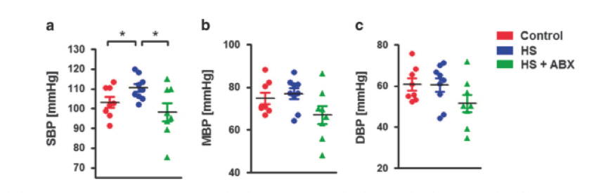 慢性HS喂養(yǎng)可能導致動脈壓升高,并且研究人員還檢測到抗生素如何影響這種進展。 如圖6所示,雖然HS處理的小鼠的DBP和平均血壓沒有增加,但是慢性HS喂養(yǎng)后SBP明顯升高。 有趣的是,抗生素治療能夠完全恢復海拔。 這些數(shù)據(jù)強烈表明慢性HS喂養(yǎng)引起的SBP升高取決于腸道微生物群。
