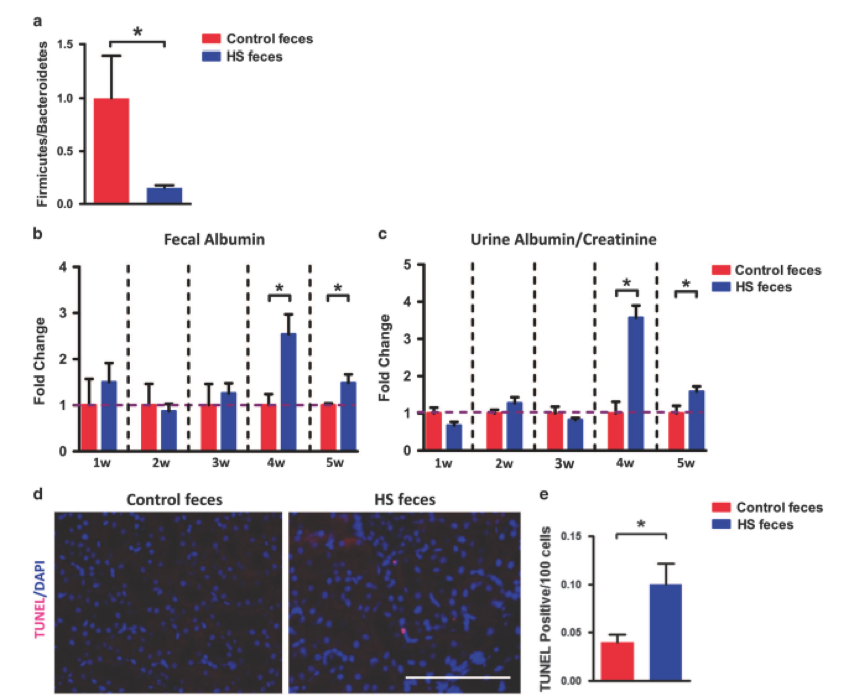 最后,為了進一步證明腸道微生物群是腎損傷發(fā)展的上游因素,進行了糞便微生物群移植實驗。喂食正常飲食(不是高鹽)的兩組小鼠口服來自對照和HS處理的小鼠的糞便。8周后,接受對照糞便的對照小鼠的盲腸壁Firmicutes/Bacteroidetes比例(其是微生物群組成改變的主要標志)顯著高于接受HS糞便的HS小鼠,其為 與研究人員之前的數(shù)據(jù)一致,表明HS喂養(yǎng)降低了盲腸中的Firmicutes / Bacteroidetes比例,并證明該糞便微生物群移植實驗是成功的(圖7a)。此外,如圖7b和c所示,給藥后4周,由糞便白蛋白含量監(jiān)測的腸道通透性在接受HS喂養(yǎng)糞便的小鼠中顯著增加,并且重要的是,尿白蛋白/肌酸酐比率(目前研究中觀察到的腎功能障礙的主要表型)在移植后4周接受HS喂養(yǎng)的糞便的小鼠中也顯著增加。最后,與對照小鼠相比,HS糞便移植小鼠中腎臟凋亡細胞的數(shù)量顯著增加(圖7d和e)。這些數(shù)據(jù)進一步表明,HS喂養(yǎng)引起的腸道生態(tài)失調是腎損傷和功能障礙的原始誘因。