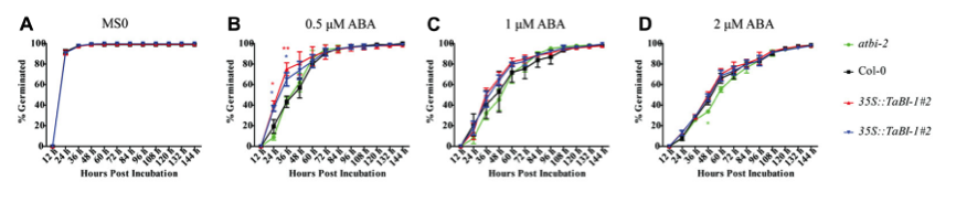研究者進(jìn)一步研究了TaBI-1.1在發(fā)芽過程中對ABA的敏感性。 在不同濃度的ABA的培養(yǎng)基上每12小時記錄發(fā)芽種子的百分比。在MS0培養(yǎng)基中,Col-0,atbi1-2和35S :: TaBI-1.1轉(zhuǎn)基因擬南芥植物顯示相似的發(fā)芽率(圖5A)。 含有0.5μMABA的培養(yǎng)基中,兩種轉(zhuǎn)基因株系萌發(fā)顯著快于Col-0和atbi1-2(圖5B)。 在含有1μMABA的培養(yǎng)基上觀察不到顯著差異(圖5C)。 在含有2μMABA的培養(yǎng)基上,Col-0和兩種轉(zhuǎn)基因品系也比atbi1-2稍快地萌發(fā)(圖5D)。 以上結(jié)果表明,TaBI-1.1轉(zhuǎn)基因擬南芥對ABA的敏感性較低。