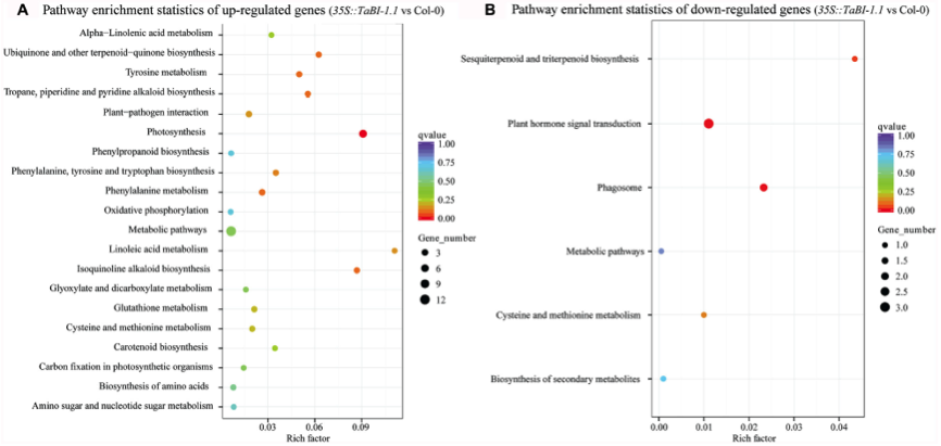 KEGG富集分析差異表達(dá)基因被呈現(xiàn)為散點圖。 使用富集因子、q值和通路中富集的基因數(shù)量來測量富集程度。 富集因子越高表示富集程度越高。觀察到上調(diào)基因富集了20多個KEGG通路。上調(diào)基因的前20個富集通路中,其中光合作用是最明顯的富集途徑(圖7A)。 光合作用的富集因子達(dá)到0.09,而q值大約為0。相反,下調(diào)基因的KEGG富集通路并不明顯,只有6個富集因子較低的通路被鑒定出來(圖7B)。因此,TaBI-1.1參與對生物脅迫的應(yīng)答并主要通過基因上調(diào)表達(dá)來執(zhí)行其防御功能。