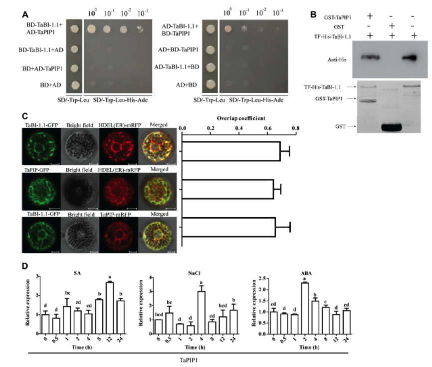 將TaBI-1.1置于PGBKT7(BD)載體中,用作誘導(dǎo)蛋白在酵母雙雜交實驗中篩選小麥cDNA文庫,以進(jìn)一步探索TaBI-1.1調(diào)節(jié)應(yīng)激反應(yīng)的細(xì)胞機(jī)制。 結(jié)果,鑒定出一個候選的相互作用物質(zhì),水通道蛋白TaPIP1。 使用酵母雙雜交和pull-down測定來確定TaBI-1.1和TaPIP1之間在體內(nèi)和體外的相互作用。將融合TaBI-1.1(BD-TaBI-1.1)的BD載體和融合TaPIP1(AD-TaPIP1)的pGADT7(AD)載體轉(zhuǎn)化到酵母細(xì)胞中。只有用BD-TaBI-1.1和AD-TaPIP1轉(zhuǎn)化的酵母細(xì)胞能夠在缺乏Trp,Leu,His和Ade(SD / -Trp-Leu-Ade-His)的選擇性培養(yǎng)基上生長。轉(zhuǎn)換TaBI-1.1和TaPIP1的融合載體產(chǎn)生相同的結(jié)果,表明TaBI-1.1與TaPIP1在酵母細(xì)胞中有相互作用(圖8A)。使用pull-down分析進(jìn)一步確認(rèn)相互作用(圖8B)。將TaBI-1.1克隆到pCold TM TF表達(dá)載體中在大腸桿菌中產(chǎn)生重組蛋白TF-His-TaBI-1.1。通過將序列克隆到pGEX-4T-1載體中,在大腸桿菌中成功產(chǎn)生了重組GST(谷胱甘肽S-轉(zhuǎn)移酶)-TaPIP1蛋白。使用抗His抗體的Western印跡所示,體外pull-down測定顯示TF-His-TaBI-1.1與GST-TaPIP1有物理互作(physically interacted)(圖8B)