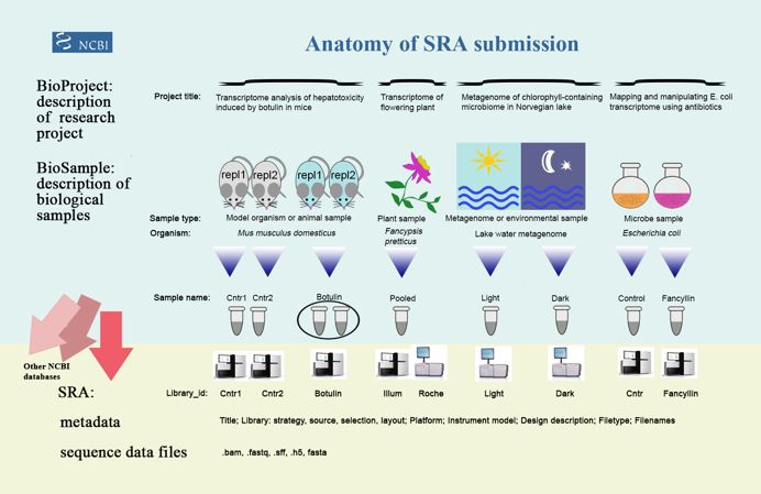 有過(guò)數(shù)據(jù)上傳經(jīng)歷的童鞋應(yīng)該對(duì)SRA并不陌生,上傳數(shù)據(jù)前我們一般要?jiǎng)?chuàng)建BioProject、BioSample,用于詳細(xì)說(shuō)明項(xiàng)目信息、樣品信息;并通過(guò)SRA的Experiment、RUN描述建庫(kù)測(cè)序相關(guān)信息,如建庫(kù)類(lèi)型、測(cè)序儀器、單雙端等;下圖概括出了幾者之間的關(guān)系。