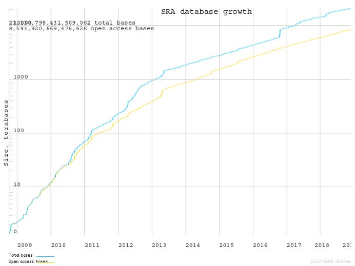 SRA數(shù)據(jù)量增長(zhǎng)圖(縱坐標(biāo)代表sra格式文件大小,單位TB;橫坐標(biāo)代表年;藍(lán)線代表總數(shù)據(jù)量)